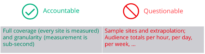Much emphasis is put by the standards on the qualifications of measurement systems themselves are not all equal with regards to transparency and accountability. For the historical reasons mentioned earlier, legacy out-of-home measurement has some catching up to do to be at the level of data fidelity delivered digitally.