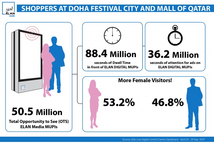 Mr. Jamie Ball, ELAN Group’s COO commented on the partnership with Quividi saying: “We are proud of our partnership with Quividi. Introducing this cutting-edge technology to our clients reinforces ELAN Media’s reputation once more as one of the most innovative media companies in the Middle East region.” Ball added: “The technology provides numbers and interpretations. For example, since 23rd of April, 2017 until date, we’ve had more than 50.5 million people walking by our assets at MoQ & DFC. We can measure their demographics, how much time they spent in front of the screen, and how engaged they were with the content of each advertisement”.