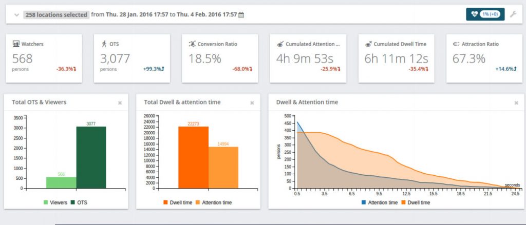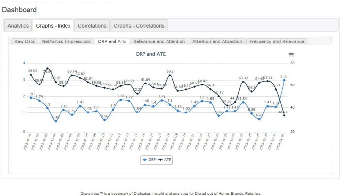 In February 2014, Dialogica introduced Dianalytics™, a web-based platform which sits on top of Quividi’s data warehouse. Dianalytics introduces a series of new ratios such as the attraction, the attention and the relevance indexes that allow meaningful benchmark of stores or locations. Furthermore, Dianalytics uses a statistical modelling which estimates the frequency of contacts of visitors with a point of interest, thus making it possible to compute net impressions, GRP and Digital Rating points. These new KPIs apply to in-store marketing, as well as digital signage and traditional media.